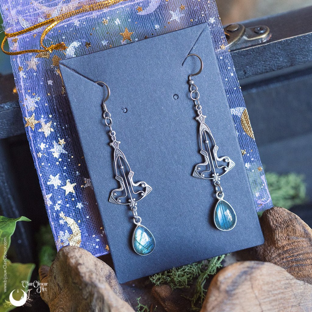 Boucles d'oreilles Fantaisie "Elwen" originales et légères avec de véritables pierres : Labradorite en forme de gouttes (facettés pour la version doré). En métal (laiton plaqué vernis et sans nickel. Crochets en Acier inoxydable et contour de la pierre en argent 925 millièmes.