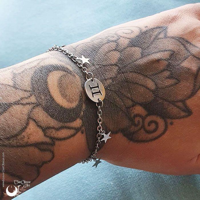 Bracelet en acier inoxydable avec un médaillon Astro (signe au choix) et des petites breloques étoiles. Le bracelet s'ajuste à votre poignet grâce à sa chaînette, de 14 à 19 cm environ.