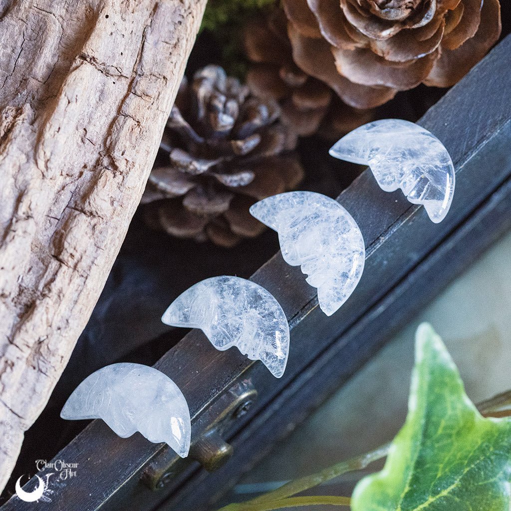 La forme de lune, symbole ancien et universel, associée à la finesse de la gravure, en fait un minéral à la fois décoratif et contemplatif. Chaque pièce est unique par ses nuances, sa transparence et ses légères variations naturelles.
